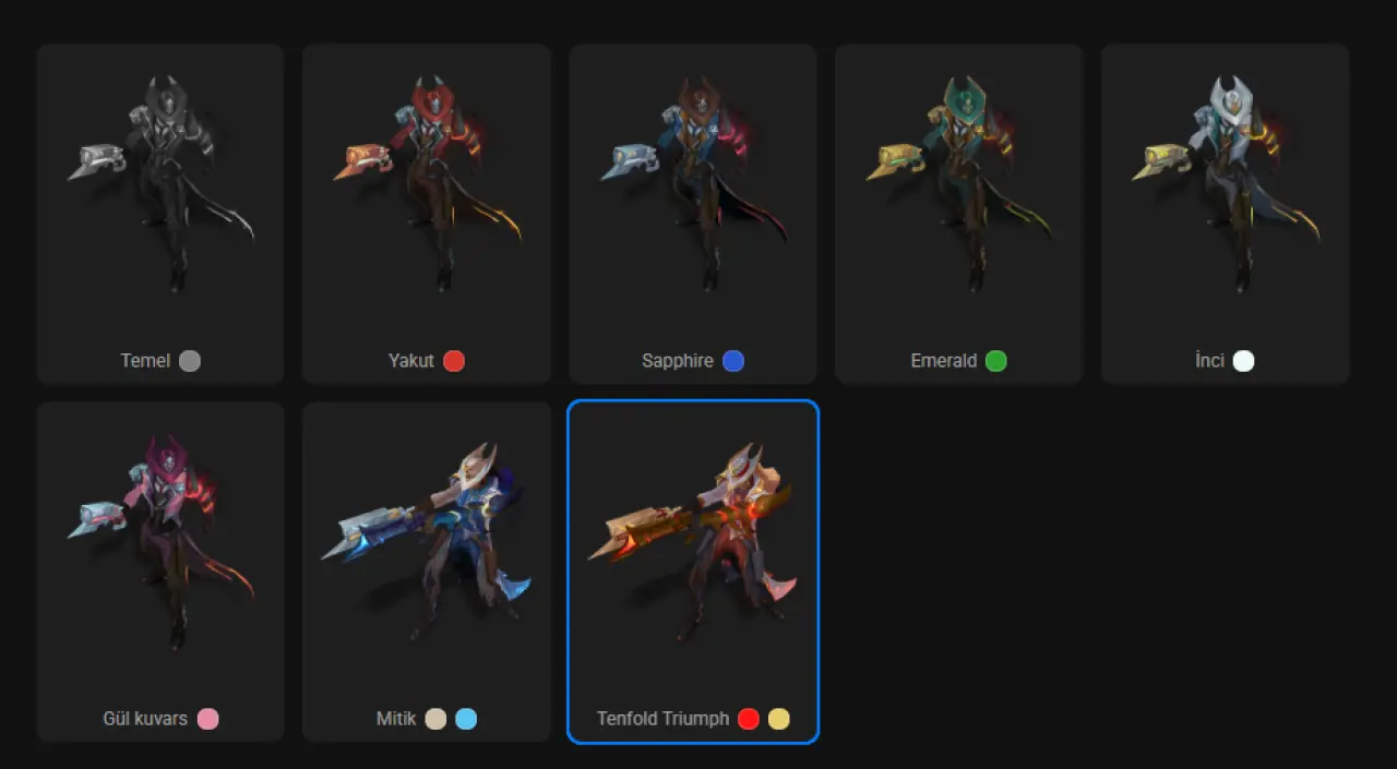 Vahşi Batılı Lucian içerisinde farklı kroma setleri bulundurarak renklendirme yapabiliyorsunuz. Bu renklendirmeler Temel, yakut, sapphire, emerald,inci, gül kuvars, mitik, tenfold triumph olarak yer alıyor. 9 farklı renklendirmesini açabilirsiniz. Görünüş stilleri ise şu şekilde yer alıyor;